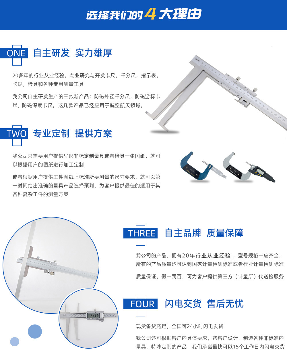 天津桂量量具刃具有限公司,擁有20年的行業(yè)從業(yè)經(jīng)驗(yàn),主要生產(chǎn)游標(biāo)卡尺卡尺,數(shù)顯卡尺,帶表卡尺,各種千分尺,百分表,內(nèi)徑百分表,高度游標(biāo)卡尺,深度卡尺,卡規(guī),檢具和各種測(cè)量工具,是一家集設(shè)計(jì)生產(chǎn),銷售為一體的企業(yè)。 我公司開(kāi)發(fā)生產(chǎn)了三款新產(chǎn)品:防磁外徑千分尺,防磁游標(biāo)卡尺,防磁深度卡尺,這幾…